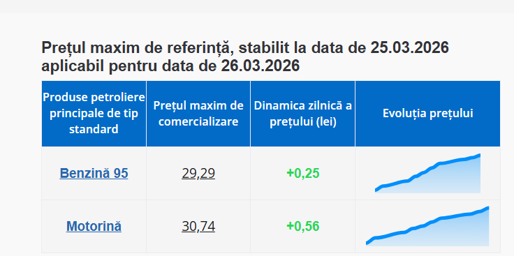 Agenția Națională pentru Reglementare în Energetică (ANRE) a stabilit prețurile maxime de comercializare a carburanților, care vor fi valabile pentru data de 25 martie 2026.